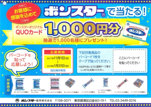 専用ハガキまたは郵便ハガキに郵便番号、住所、電話番号、氏名、年齢、性別、お買い上げ店名、アンケートを明記の上、対象商品のバーコードを貼って応募すると、抽選で1000名にボンスターオリジナルQUOカード1000円分が当たります。
